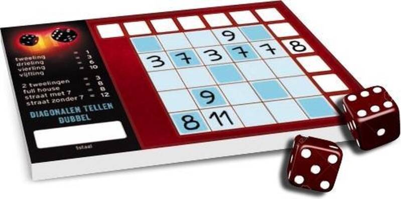 Eenvoudige regels, spannend, geen wachttijden. Iedereen schrijft dezelfde getallen op zijn blad, maar bepaalt zelf in welke velden. Probeer op die manier combinaties te maken zoals one pair, two pair of full house die je punten opleveren. De mogelijkheden zijn enorm.